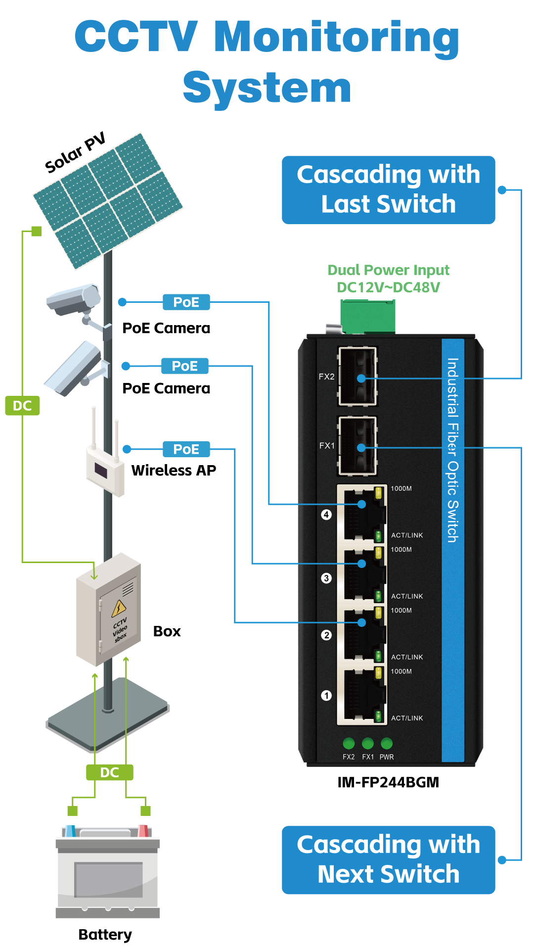 •  Built-in voltage booster for DC12-48V input which can be used for solar power/Trunk/VoIP system/CCTV security system